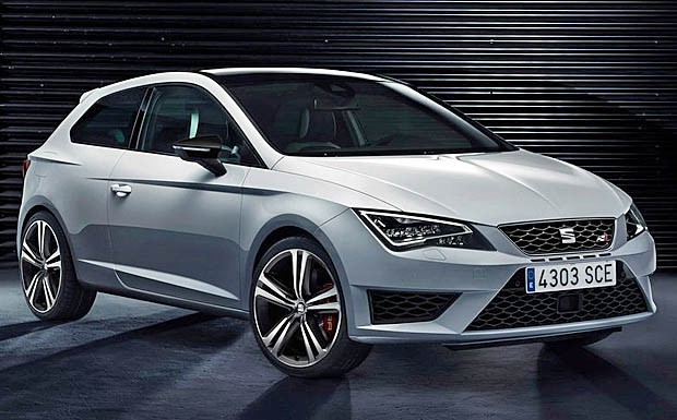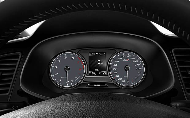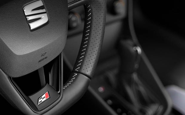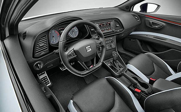 von 8: Im Innenraum des Seat Leon Cupra kommen Sportsitze mit dunkelgrauem Alcantara-Bezug und ein Sportlenkrad zum Einsatz. Wahlweise gibt es eine schwarze Vollleder-Ausstattung. Pedale und Einstiegsleisten sind in Aluminium gefertigt.