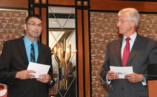 von 15: Thomas Wagner (l.), Serviceleiter beim Autohaus Falter (im Bild mit Stefan Gaul, Geschäftsführer API Automotive Process Institute), erläuterte seine positiven Erfahrungen mit dem Direktannahmeroboter R-2000.