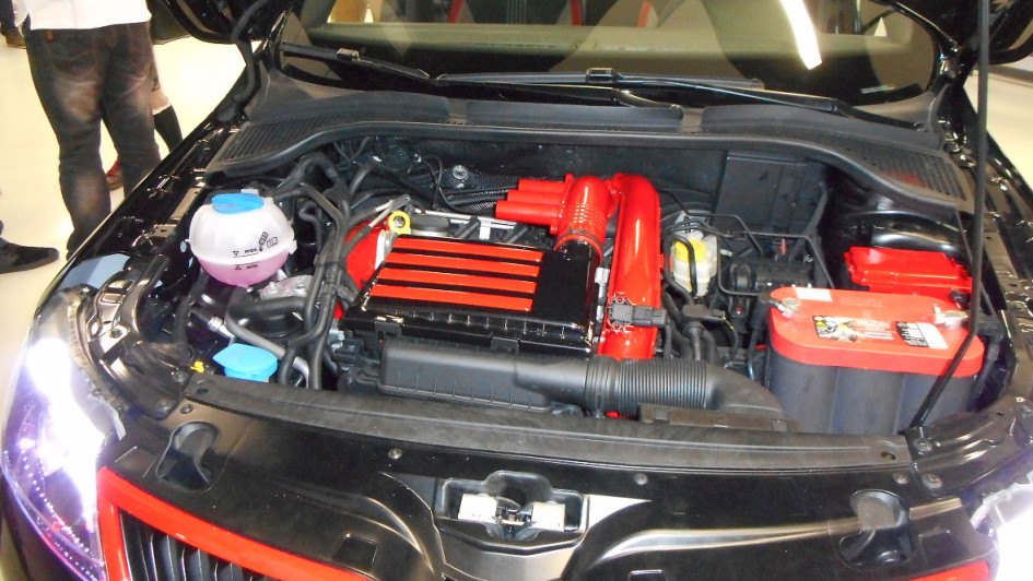 von 8: Das 4,30 Meter lange Coupé der Skoda Azubis basiert auf dem Rapid Spaceback. Mit 92 kW / 125 PS ist der 1,4 TSI ordentlich motorisiert, und auch auf dem Aggregat findet sich die Farbe Rot wieder.
