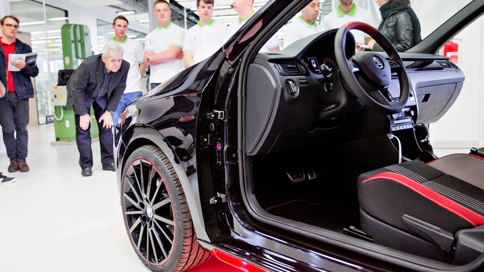 von 8: Das 26-köpfige Azubi-Team von Skoda präsentiert in den Räumen der Berufsschule am Stammsitz in Mladá Boleslav ihr Projekt-Auto: den Atero.