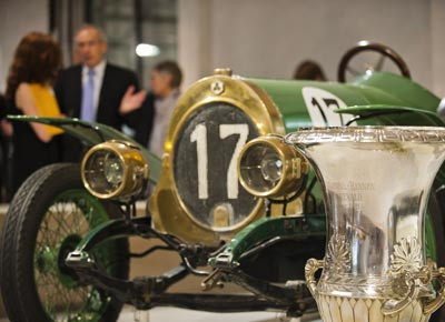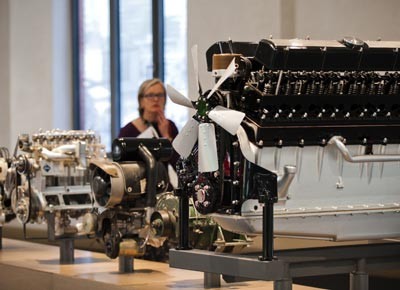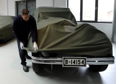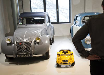 von 10: Ein Besucher betrachtet im Deutschen Technikmuseum in der Ausstellung "Mensch in Fahrt - unterwegs mit Auto und Co" ein Spielzeugauto, das zwischen einem Citroen 2 CV (1955, l.) und einer VW Limousine (Exportmodell, 1951, r.) steht.