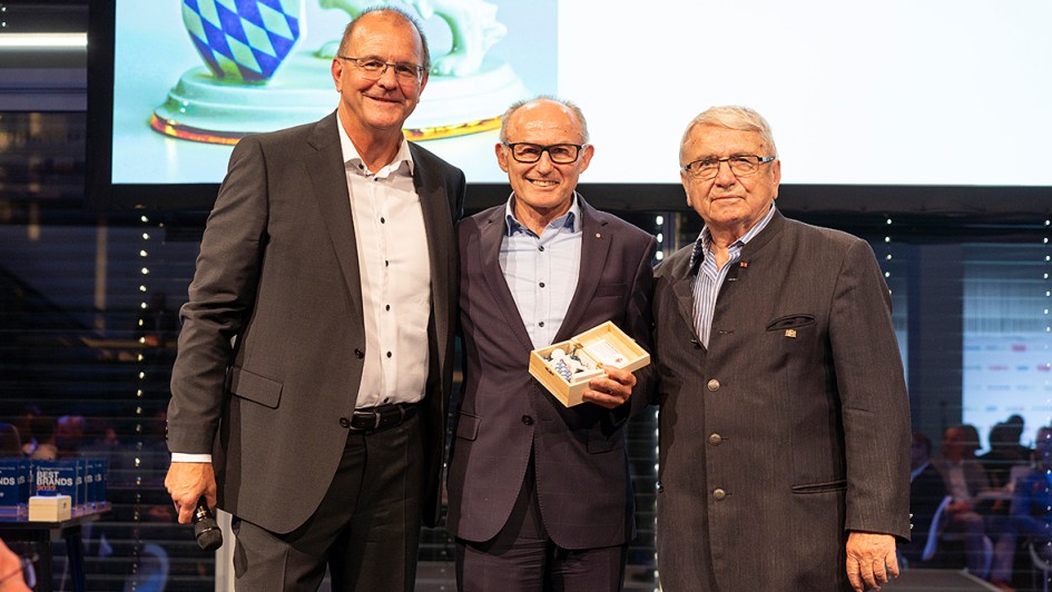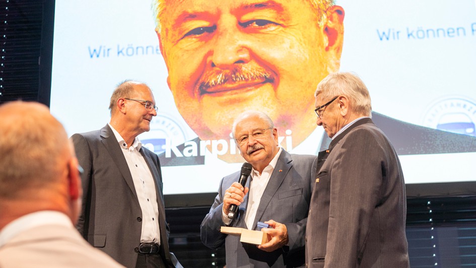 von 58: AUTOHAUS-Chefredakteur Ralph M. Meunzel (l.) und der Ehrenpräsident des Kfz-Landesverbands Bayern, Klaus-Dieter Breitschwert (r.), würdigten ZDK-Präsident Jürgen Karpinski für seine Verdienste mit einem "Bayerischen Löwen" aus dem bayerischen Landtag.