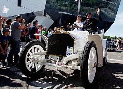 von 13: Die britische Rennfahrerin Susie Stoddart (M.) und Michael Plag (M., r.) vom Mercedes Benz Classic Center, fahren im Mercedes-Benz des Typs Simplex von 1902