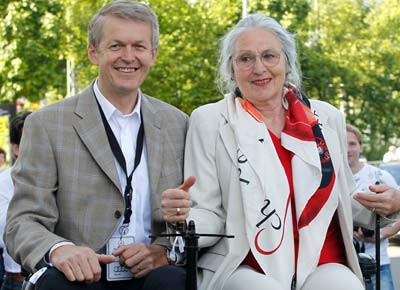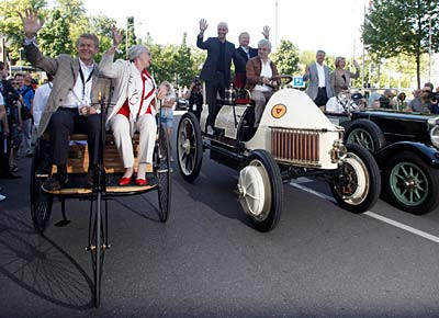 von 13: Thomas Weber, Vorstandsmitglied der Daimler AG, und Jutta Benz in einem Patentwagen.
