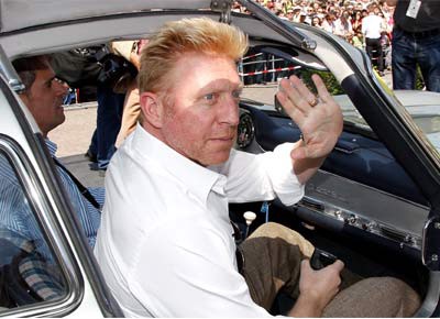von 13: Der ehemalige Tennisspieler Boris Becker posiert beim Einsteigen in einen Mercedes-Benz 300 SL Baujahr 1954.