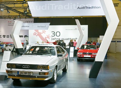 von 18: Der Messeauftritt von Audi steht unter dem Schwerpunkt Motorsporttradition. Ehemaligen Renntourenwagen stellt die VW-Tochter Serienmodelle gegenüber.