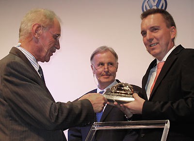 von 17: Detlef Wittig, Konzernvertriebschef Volkswagen AG, beglückwünscht Henri Strübing. In der Mitte: Jens-Peter Heuer, Staatssekretär in der Senatsverwaltung für Wirtschaft, Technologie und Frauen. (Foto: Ralph M. Meunzel/AUTOHAUS)