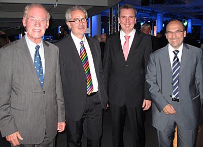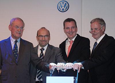 von 17: Detlef Wittig, Henri Strübing, Burkhard Weller und Christian Klingler bei der Eröffnung des VW Autohauses Charlottenburg. (Foto: Ralph M. Meunzel/AUTOHAUS)