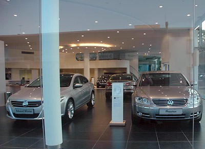 von 17: Der Blick in den Showroom zeigt: Passat CC und Phaeton warten bereits auf Kunden. (Foto: Sabine Tilp/AUTOHAUS)