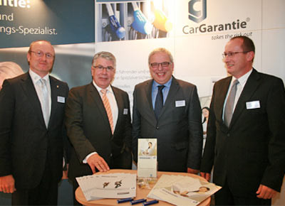 von 10: Auch die CarGarantie war wie immer als Aussteller vertreten, Präsident Heinz Preiß (2.v.li.) begrüßte die Vertreter an ihrem Stand, v.li.: Dirk Heinemann, Vertriebsdirektor Bernhard Becklönne und Thomas Schwarzenberger.