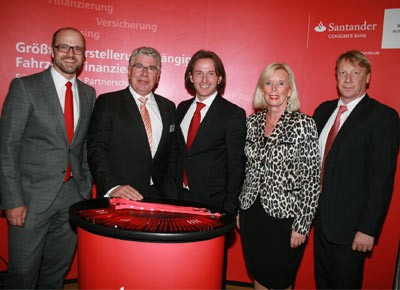 von 10: Die Santander Consumer Bank wird ab Januar 2012 die neue Captive von Volvo. Präsident Heinz Preiß (2.v.li.) begrüßte die Vertreter an ihrem Stand, v.l.: Sönke Roggenbuck, Thomas Hanswillemenke, Marion Johl und Uwe Haas.