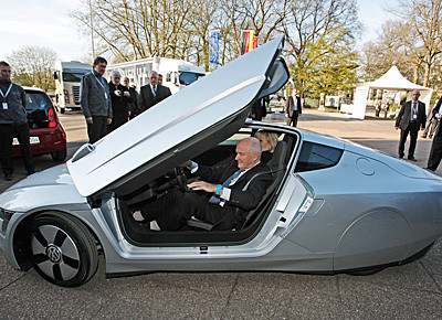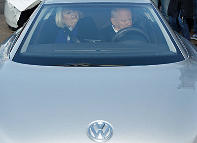 von 9: Gemeinsam mit dem Gatten kam sie im 1-Liter-Konzeptfahrzeug XL1 zur Versammlung. (Foto: Philipp Guelland/dapd)