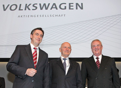 von 9: David McAllister, Niedersächsischer Ministerpräsident und VW-Aufsichtsrat, Aufsichtsratschef Ferdinand Piëch und Vorstandsvorsitzender Martin Winterkorn feuen sich über die Konzern-Erfolge. (Foto: VW)