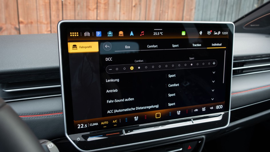von 24: Innen spielt VW beim VW ID.7 Tourer GTX mit der Farbe rot. Alles zwar dezent, aber eben auch wenig sportlich. Das Head-up-Display ist serienmäßig vorhanden und erstklassig – jetzt auch mit verzichtbarem Augmented Reality-Schnickschnack beim Navigieren mit Apple Karten (und bei Android-Geräten mit Google Maps).