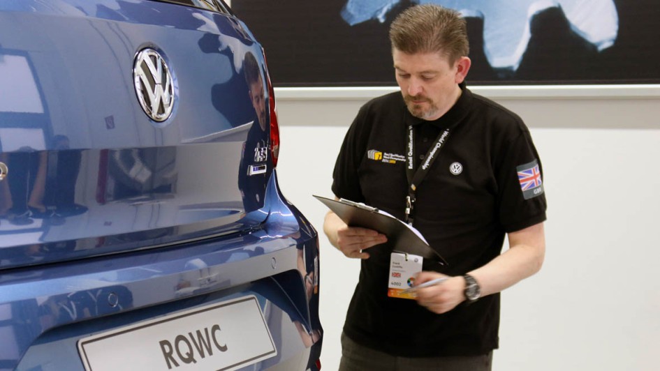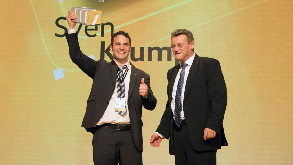 von 6: v.l.: Sven Krump, Gesamtsieger in der Kategorie Servicetechniker, freut sich gemeinsam mit Peter Maiwald, Leiter After Sales Marke Volkswagen Pkw, über seinen Erfolg.