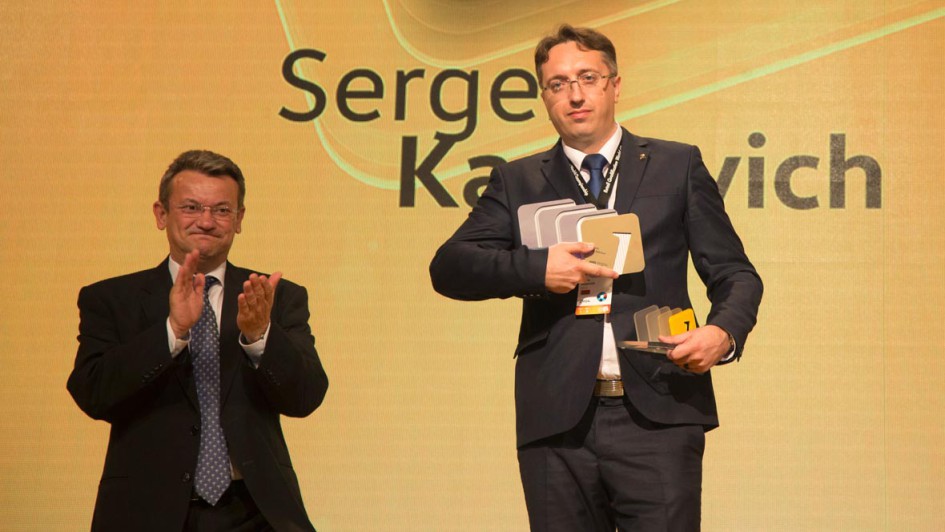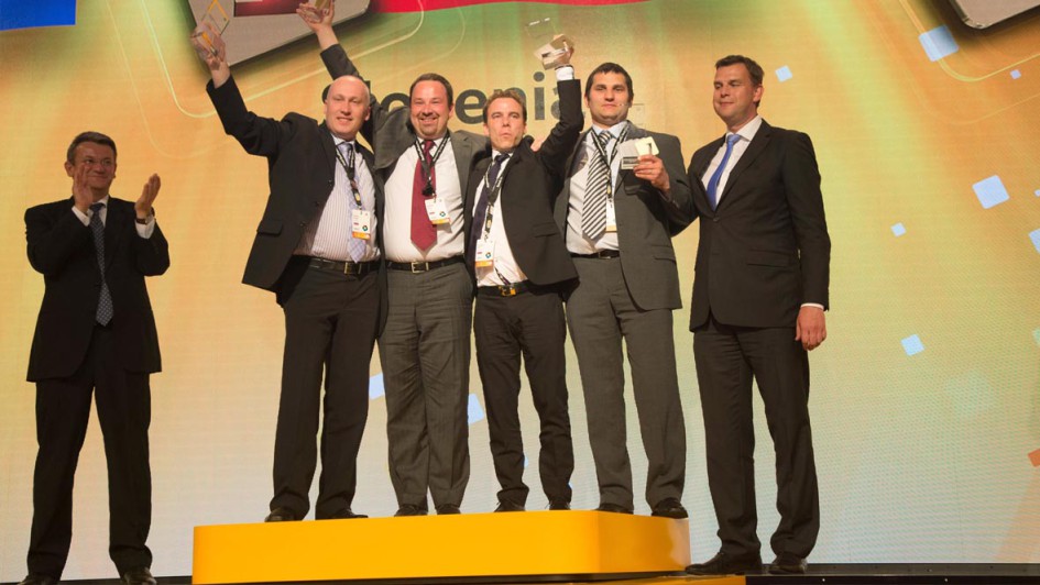 von 6: Bester Experte in der Kategorie Teiledienst: (v.l.) Sergej Karpovich aus Weißrussland wird von Peter Maiwald, Leiter After Sales Marke Volkswagen Pkw, zum Titel gratuliert.