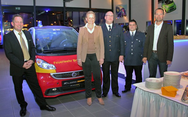 von 6: Christoph Maushardt, der Reifendienst Pneuhage und der Media Markt Bruchsal spendierten der Freiwilligen Feuerwehr Bruchsal aus Dankbarkeit für ihren Einsatz einen Feuerwehr-Smart. Hätten die 110 Feuerwehrleute die Flammen nicht bezwungen, hätte das Feuer wahrscheinlich auch auf Pneuhage und den Media Markt übergegriffen.