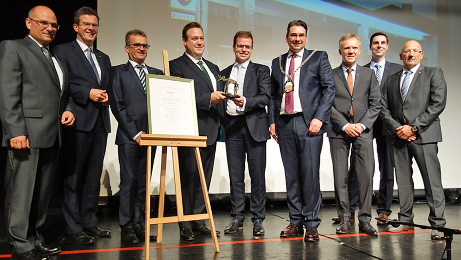von 15: WFG-Geschäftsführer Jörg Hakenesch (l.): "Eine goldrichtige Entscheidung, dass in diesem Jahr die Ostendorf GmbH mit diesem wichtigen Preis ausgezeichnet wird." Und Pro Ahlen“-Vorstand Peter Schmid (zw.v.li.): "Eigentlich sind es drei markante Bereiche, die bei Ostendorf den Überbau darstellen: 1. Kontinuität. 2. Mut im Unternehmertum. 3. Die Mitarbeiter stehen zum Unternehmen. In acht Jahrzehnten hat es die Familie Ostendorf geschafft, mit allen Herausforderungen zu wachsen und sich als feste Größe für Mercedes in der Region zu präsentieren." Ostendorf wurde von MB in den vergangenen beiden Jahren mit der höchsten Kundenzufriedenheit in Deutschland ausgezeichnet. Timm Ostendorf machte deutlich, dass er die Auszeichnung für das gesamte Unternehmen versteht und bat seine Führungskräfte mit auf die Bühne. Im Bild Klaus Gebauer, Timm Ostendorf, Ralf Strohbücker, Dr. Alexander Berger, Christian Fredebeul, Jörg Hellwig und Thorsten Mintert.