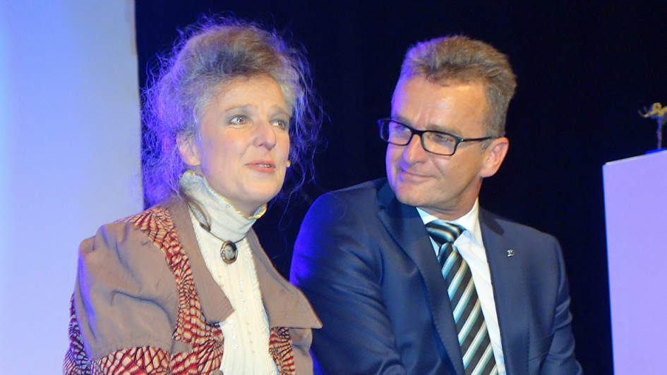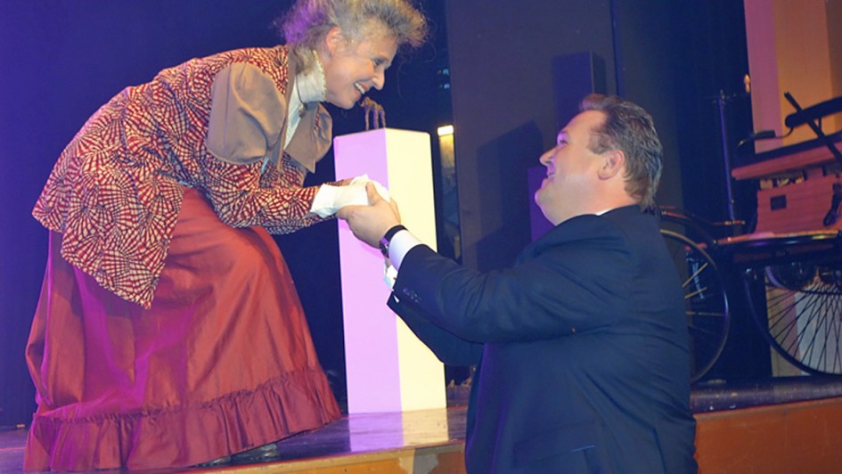 von 15: Bertha Benz hatte offensichtlich bezirpsenden Charme. So nebelte sie Centerleiter und Prokurist Klaus Gebauer gleich mehrfach ein, zuletzt singend im Duett.