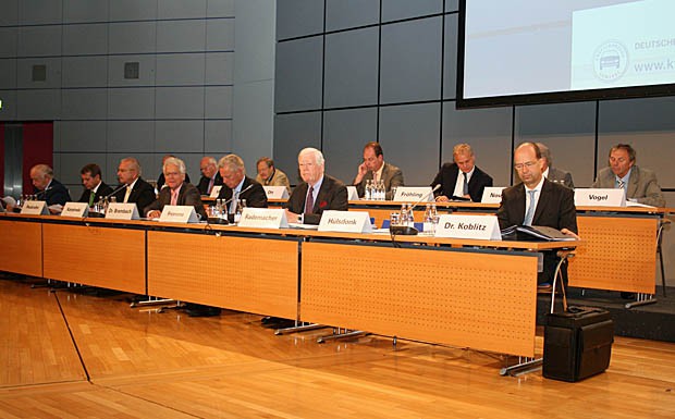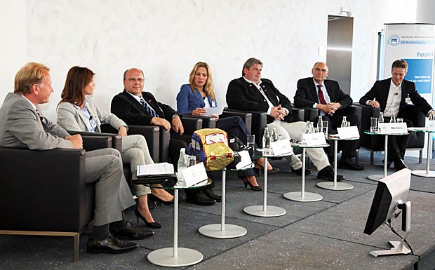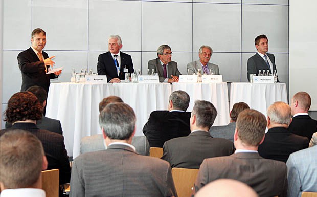 von 16: Zum Thema Hauptuntersuchung im Meisterbetrieb diskutierten v.l.: Rudolf Angerer, Obermeister der Innung Oberpfalz und Kreis Kelheim, Prof. Jürgen Brauchmann, Vorsitzender der Geschäftsführung des TÜV Rheinland, Heribert Braun vom Bundesverkehrsministerium, Hans-Peter Lange, Landesverband des Kfz-Gewerbes Berlin-Brandenburg und Bundesinnungsmeister Wilhelm Hülsdonk.