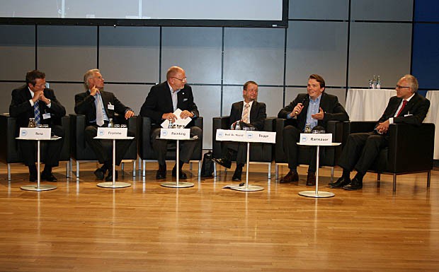 von 16: Das bestbesuchte Forum beschäftigte sich mit dem Thema Neuwagenverkauf im Internet. Die Teilnehmer v.l.: Michael-Julius Renz (Audi), ZDK-Vizepräsident Ulrich Fromme, Moderator Guido Reinking, Prof. Stefan Reindl (IFA), Alexander Bugge (MeinAuto.de) und Helmut Ramsauer (ADAC).