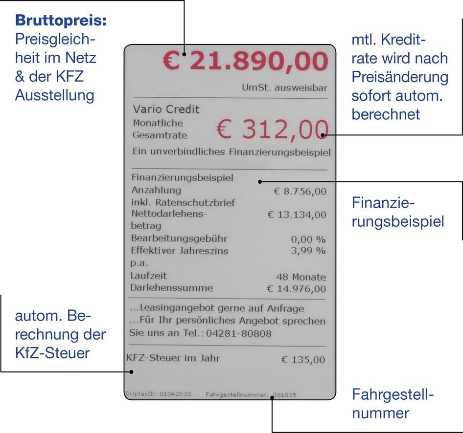 Die Nutzenfaktoren für das elektronische Preisauszeichnungsschild (ePAS) sind selbstredend. Zeitersparnis! Keine Schlüsselsuche, kein manuelles Preisschilder-Wechseln mehr, keine Wetterabhängigkeit. Schnelligkeit! Preisupdates sind rund um die Uhr an sieben Tagen der Woche von der Zentrale, eben auch für mehrere Filialen steuerbar. Preisgleichheit, im Netz wie auf den Neu- und GW-Plätzen. Leicht in bestehende Software-Systeme integrierbar. Und wichtig: Bezahlbar!