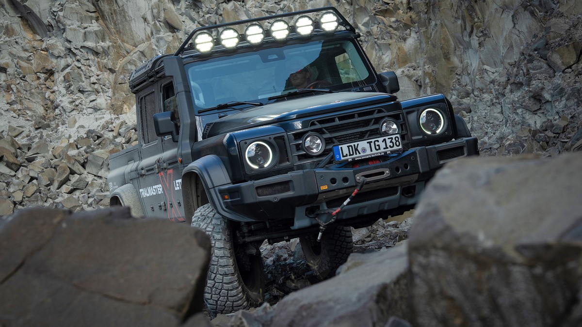 Wer hier mehrmals täglich ein- und aussteigt, der kann sich daheim die Klimmzüge im Türrahmen sparen. Drinnen angekommen, genießt der Betriebsleiter kurz die Aussicht, greift dann wie ein Pilot im Cockpit in die Bedienkonsole im Dach, aktiviert die Geländeuntersetzung, schaltet die Differentialsperren ein und fährt unbeirrt in die Geröllhalde. Der drei Liter große BMW-Diesel hallt rau von den Wänden wider, aber er treibt den Grenadier mit 249 PS und 550 Nm scheinbar mühelos voran. Zwar nur im Schritttempo, aber dafür buchstäblich über Stock und Stein.