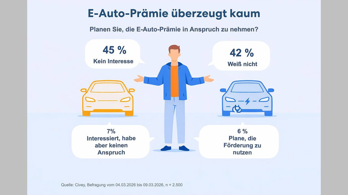 Über die Hälfte der Autofahrerinnen und Autofahrer in Deutschland (57 %) bewerten laut der Umfrage für den Direktversicherer DA Direkt die neue Kaufprämie der Bundesregierung für E-Autos negativ. Lediglich eine kleine Minderheit von 6 Prozent der potenziellen Autokäuferinnen und Autokäufer plant, die Förderung in Anspruch zu nehmen.