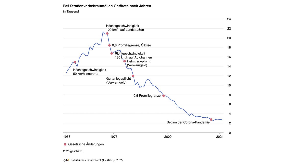 Die Zahl der Verkehrstoten auf deutschen Straßen wird im Jahr 2025 voraussichtlich steigen. Nach Schätzungen des Statistischen Bundesamtes (Destatis) auf Basis vorliegender Daten für den Zeitraum von Januar bis September werden 2025 in Deutschland rund 2.810 Menschen bei Verkehrsunfällen ums Leben kommen. Im Jahr 2024 waren es 2.770 Getötete. Ihren bisherigen Tiefststand hatte die Zahl der Verkehrstoten im (Corona)-Jahr 2021 mit 2.562 getöteten Personen erreicht.